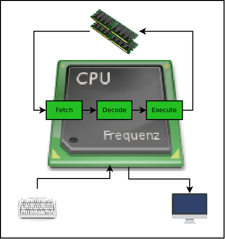 Now lets see how all of these interact with one another. Every CPU when powered on will have to read its first instruction to execute. The location of this very first instruction in RAM is usually hard coded to a predefined location by convention. This is when CPU starts interacting with RAM for the first time. Once it fetches the instruction from RAM. It tries to decode it, meaning, it tries to understand want it should do with it. After that, it will execute the operation. As part of this execution any new results will be saved backed to RAM. This process repeats forever. This is the classic Fetch-Decode-Execute cycle. In the process CPU may also interact with keyboard and display. Below illustration explains the process.